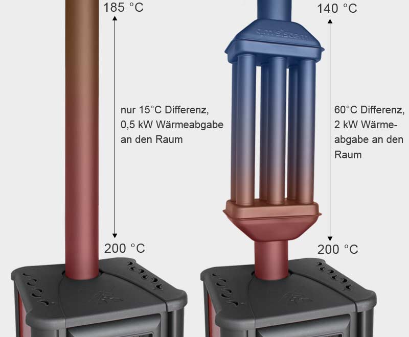 Viele Kaminöfen haben eine sehr hohe Abgastemperatur. Der Abgaswärmetauscher sorgt dafür, dass die Wärme an den Raum abgegeben wird anstatt sinnlos durch den Schornstein nach draußen zu verschwinden.