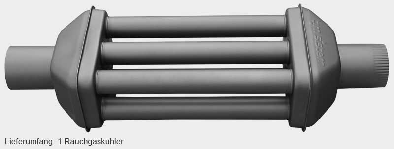 Sie können den Rauchgaskühler für neue oder bereits bestehende Anlagen verwenden. Er kann ganz einfach statt eines herkömmlichen 1m-Rohrs eingesetzt werden. Der Rauchgaskühler kann bis zu 3,6 kW zusätzlich an den Raum abgeben!