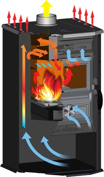 - Hinter dem Brennraum befinden sich Hohlkammern, die dafür sorgen, dass die Rückseite des Ofens nicht zu heiß wird. Dadurch kann der Konstantin nach hinten mit nur wenigen Zentimetern Abstand zu einer nicht brennbaren Wand aufgestellt werden.