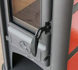 • Rüttelrost: rechts neben dem Aschenkasten ist der Hebel für den Dreh-Rüttelrost zu sehen. Mit diesem können Sie ganz einfach Asche und andere Rückstände in den Aschenkasten befördern, sodass die Luft weiterhin ungehindert nach oben in den Brennraum strömen kann.