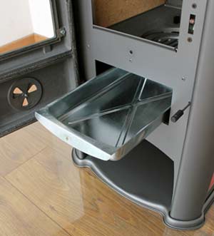- Rüttelrost: rechts neben dem Aschenkasten ist der Hebel für den Dreh-Rüttelrost zu sehen. Mit diesem können Sie ganz einfach Asche und andere Rückstände in den Aschenkasten befördern, sodass die Luft weiterhin ungehindert nach oben in den Brennraum strömen kann.