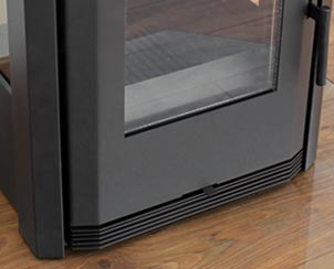- Der Holzofen verfügt über ein ausgeklügeltes Luftströmungssystem, das eine kontinuierliche Verbrennung erlaubt und die Scheibe weitestgehend rußfrei hält. An dem unteren Drehregler kann die Primärluft eingestellt werden. (Ideal beim Anheizen!)