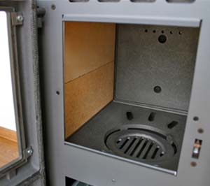 - Der Rüttelrost liegt deutlich niedriger als die Feuerraumöffnung. Ein Holzfang verhindert, dass Asche und Glut herausfallen. Brennmaterial kann somit bequem nachgelegt werden.