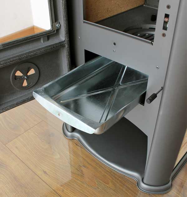 - Der Kaminofen verfügt über einen herausnehmbaren Aschekasten, wodurch sich die Brennkammer unkompliziert und schnell reinigen lässt.